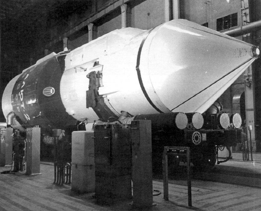 Left: The second Salyut space station, shown with its launch shroud attached in the assembly building at the Baikonur Cosmodrome in Kazakhstan, was lost in a launch failure. Right: Aleksei A. Leonov, left, and Valeri N. Kubasov, the first crew assigned to the second Salyut space station wearing the new Sokol launch and entry suits. Credit: Images courtesy of RKK Energia.