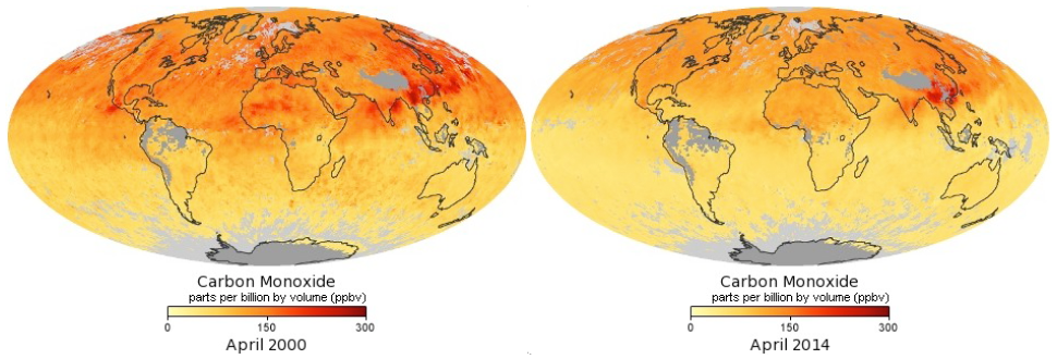 Carbon monoxide is a colorless, odorless pollutant that emerges from wildfires, vehicle tailpipes and other human sources. Once in the atmosphere it is one of the ingredients for ground-level ozone, a harmful pollutant that contributes to smog – sometimes thousands of miles from where the carbon monoxide originated. An instrument on Terra called Measurements of Pollutants in the Troposphere, or MOPITT, was the first dedicated to tracking sources of carbon monoxide and following the gas across the globe. And the news is good. With MOPITT data, combined with data from the Atmospheric Infrared Sounder, or AIRS, on Aqua and the Tropospheric Emissions Spectrometer, or Tes, on Aura, as well as European satellite data, scientists have found that carbon monoxide emissions have declined at a rate of one percent per year since 2000.