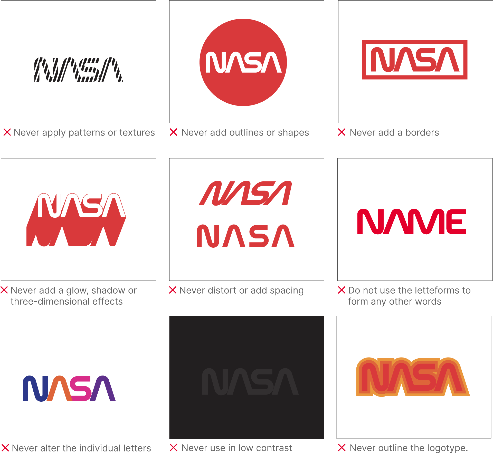 NASA’s insignia and logotype are frequently copied for distribution online and often contain errors. Avoid “imposter” graphics by only using official artwork files provided by NASA for your products. The following are examples of common errors found in online sources:
