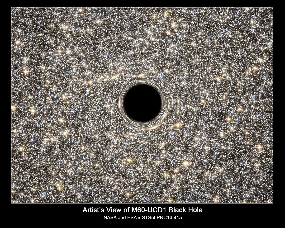 The black hole is five times the mass of the one at the center of our Milky Way galaxy. It is inside one of the densest galaxies known to date — the M60-UCD1 dwarf galaxy that crams 140 million stars within a diameter of about 300 light-years, which is only 1/500th of our galaxy’s diameter.