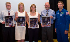 Four of the seven NASA Space Flight Awareness honorees from NASA’s Dryden Flight Research Center display their awards that were presented in recent ceremonies at NASA’s Kennedy Space Center in Florida. From left are Richard Dykstra, Judy Grizzard, Lori Losey and Richard Batchelor. NASA astronaut Mike Barratt, at right, presented their awards. Three other Dryden honorees, James Pavlicek, David Jones and Michael Webb, were unable to attend the event. (NASA Photo)