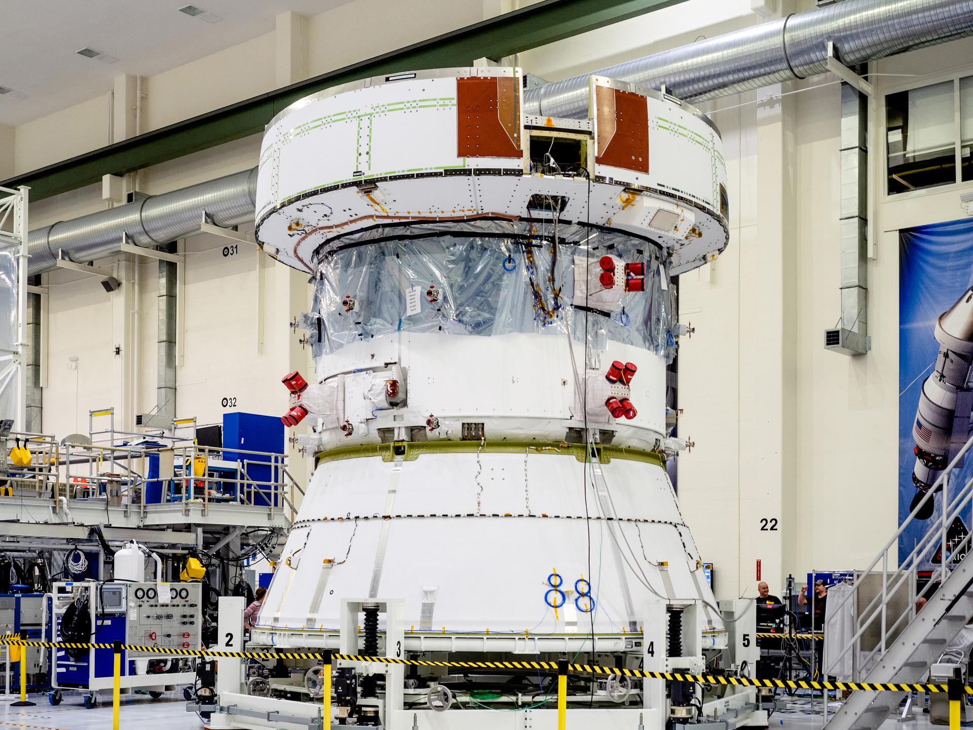 Orion’s European Service Module is the powerhouse that fuels and propels the Orion spacecraft in space. Located below the crew module, it provides critical functions including propulsion, thermal control, and electrical power generated by solar arrays. The service module will also provide life support systems including water, oxygen, and nitrogen for the crew. In addition to its function as the main propulsion system for Orion, it is responsible for orbital maneuvering and position control.