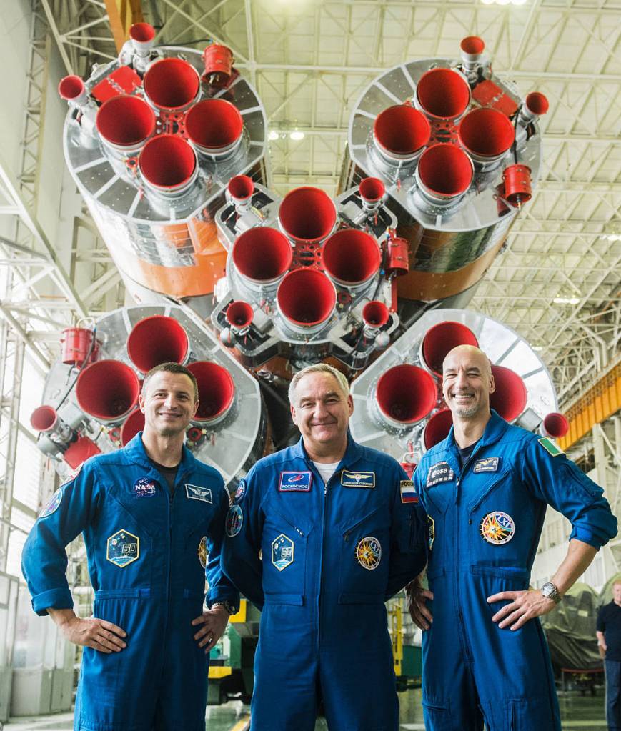 It's dinner time aboard the International Space Station as five Expedition 60 crewmembers gather inside the Zvezda service module's galley.