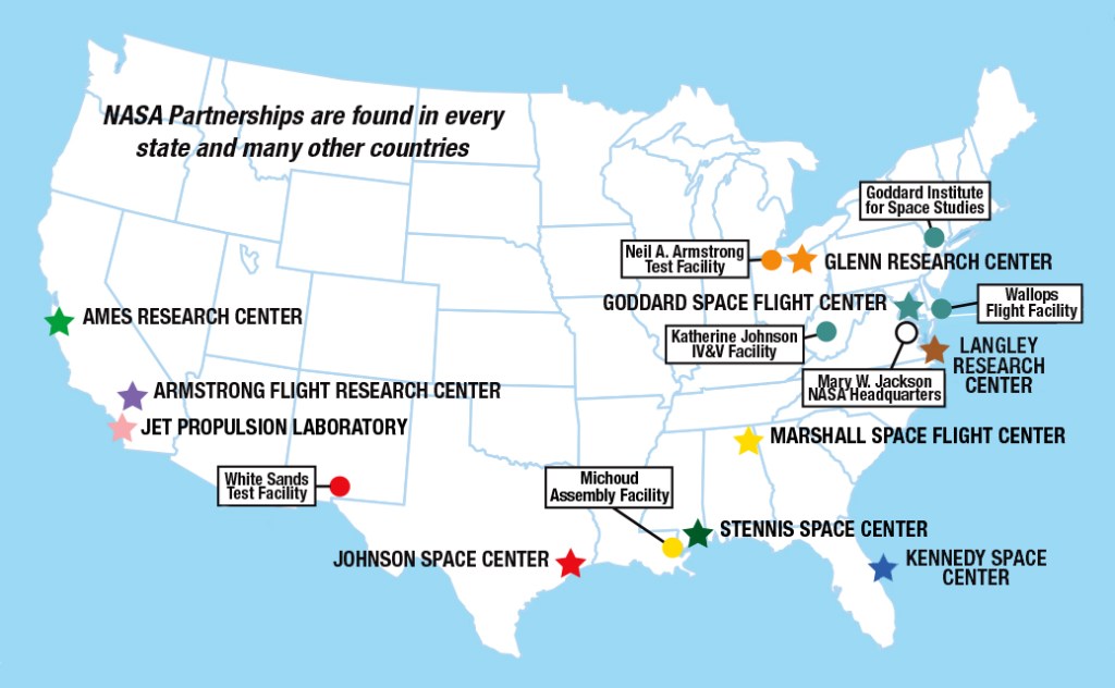 NASA Partnerships are found in every state and many other countries. NASA centers and facilities offer 60 years of experience in advanced engineering, cutting-edge research and technology development, as well as unique assets such as land, facilities and laboratories for use by commercial industries, academic institutions, U.S. Government agencies, and international entities.