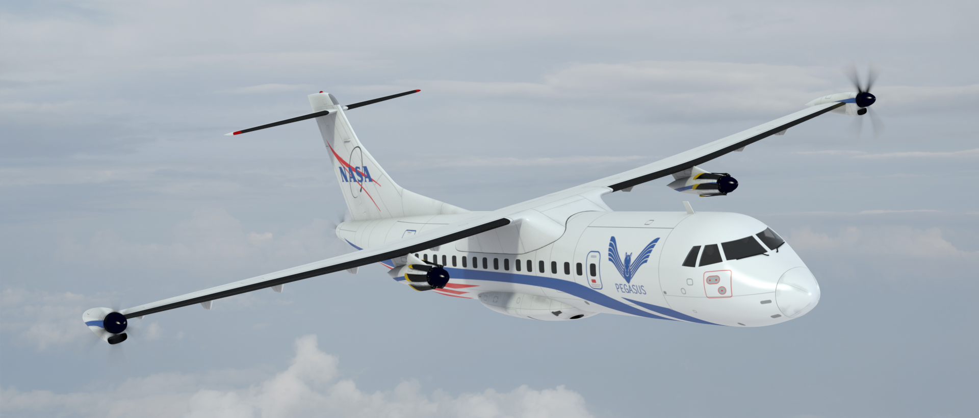 The Parallel Electric-Gas Architecture with Synergistic Utilization Scheme (PEGASUS) concept is a novel hybrid electric regional aircraft that could reduce operational costs by lowering the amount of energy required to complete a given mission. The PEGASUS concept was designed to satisfy both hybrid (gas and electric) and purely electric missions. PEGASUS’s hybrid electric and electric propulsors are located strategically to provide increased aerodynamic benefits. PEGASUS uses parallel hybrid electric propulsors at the wingtips to decrease downwash effects, reducing the energy needed to maintain flight. Two electric propulsors providing additional thrust for takeoff and climb are located inboard on the wing. These propulsors are capable of folding mid-flight to decrease windmilling effects during cruise. Recent research suggests that adding a final electric propulsor to the tail of the aircraft will provide a benefit due to boundary layer ingestion.