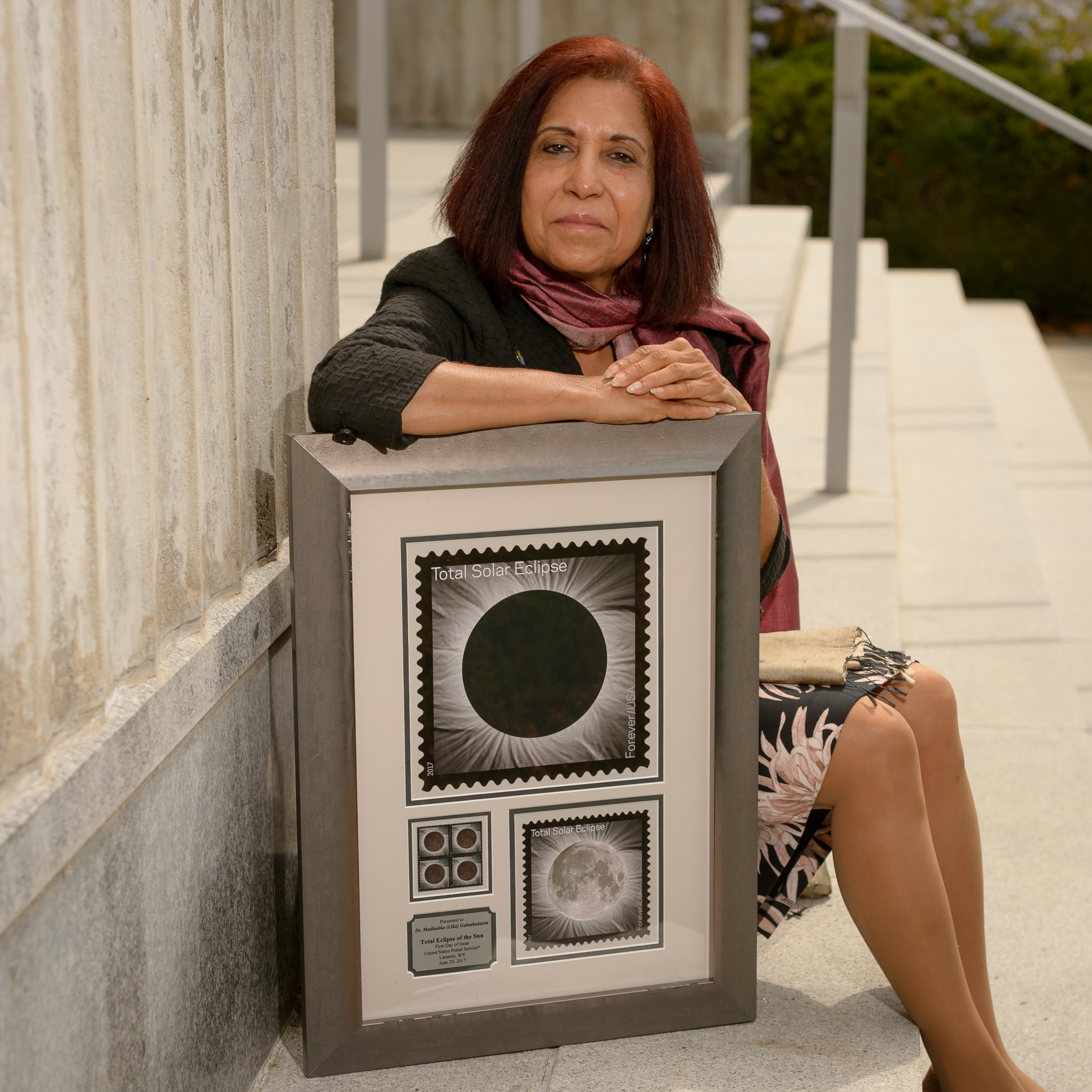 Lika Guhathakurta: Door to door. So when they approached us last year that they wanted to create an eclipse stamp, and you know I participated in that event, and worked with them. And then the unveiling of the fabulous stamp, first ever kind of “forever” stamp. It’s a thermochromic stamp with the eclipse image with a dark center. Then, if you put your body heat into the dark region, then it transforms and gives you the topography of the Moon. That’s a stamp. That is within reach for everyone in America.