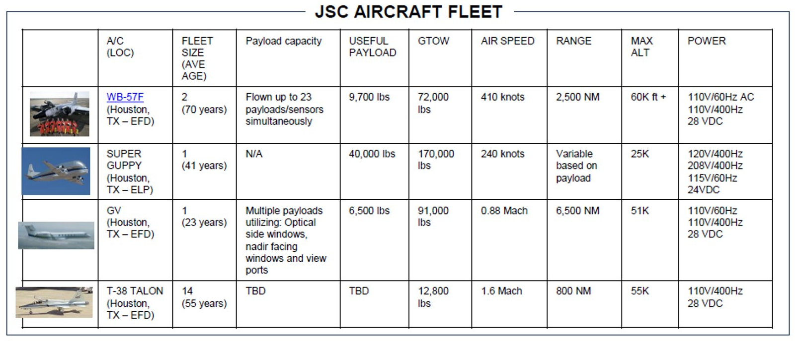 NASA JSC’s services in Aircraft Operations include various aircraft for a variety of purposes. From launch and landing imagery of space vehicles, providing critical in-flight component performance verification, to transporting large cargo, these specialized aircraft enable human spaceflight. The Gulfstream aircraft offer a reliable, configurable, and comfortable platform for Soyuz Direct and Commercial Crew Program Crew Return missions, as well as for supporting the NASA Airborne Science Program, earth science research, and advanced technology testing globally. The NASA Super Guppy, with its immense cargo area, can transport oversized cargo efficiently. Additionally, the NASA WB-57 Program offers unique, high-altitude platforms for scientific research and advanced technology development, capable of operating from sea level to over 60,000 feet for extended periods, supporting US Government agencies, academic institutions, and commercial customers worldwide. We invite our partners to leverage our unique capabilities in Aircraft Operations to enable their own research and operations.