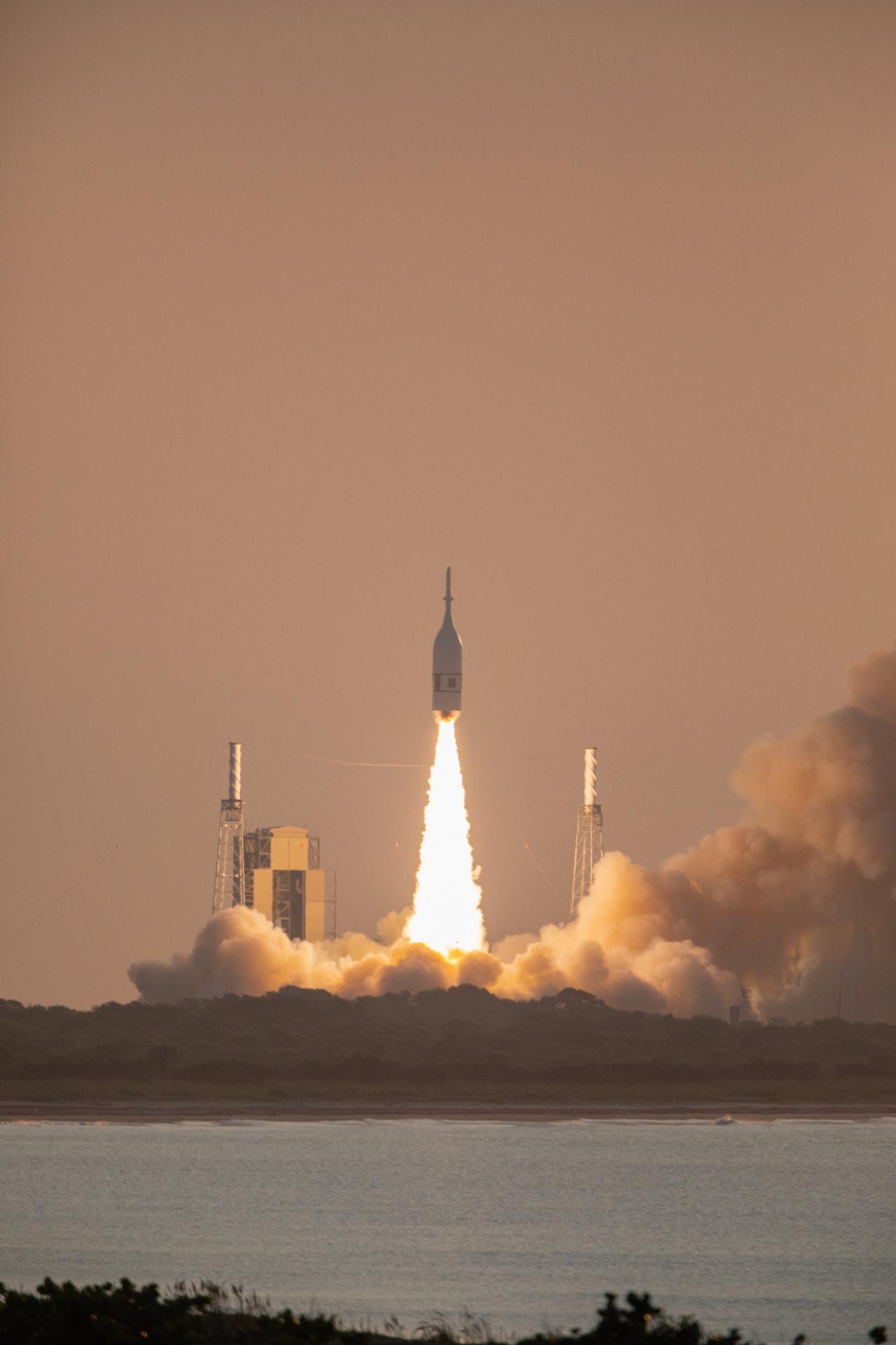 At 7:05 a.m., the three-core first stage of the Delta-IV Heavy rocket ignited, lifting Orion off to begin the mission. Approximately four minutes after liftoff, the two side boosters separated as the center core continued firing. The second stage ignited after separation to begin the first of three planned burns. During the first burn, the service module’s protective fairing separated, followed by the launch abort system. This first burn of the second stage placed the spacecraft into a preliminary 115-by-552-mile parking orbit. After completing one revolution around the Earth, during which time controllers in Mission Control in Houston verified the functioning of the spacecraft’s systems, the second stage ignited a second time, raising Orion’s apogee, or high point, above the Earth to 3,600 miles. During the coast to apogee, Orion remained attached to the second stage and completed its first crossing through the inner Van Allen radiation belt.