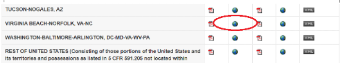 A. Pay is set by OPM rules. A full-time civil servant position is 80 work hours per two-week pay period (i.e., average 40 hours per week). Learn more about the General Schedule (GS) classification and pay system here. The total salary incorporates the GS base pay plus the locality pay for the Hampton Roads geographic area. To see the total annual salary table for a GS position with SACD, go to the OPM page Salaries & Wages then click ‘[YYYY] GS Pay Tables’ then click the Annual Rate column’s globe icon next to ‘VIRGINIA BEACH-NORFOLK, VA-NC’. Below is a screenshot of the 2026 GS Pay Table with that icon circled. A new GS employee is usually hired at step one of the applicable GS grade level.