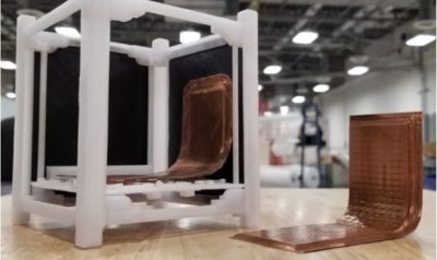 Ultrasonic additive manufacturing (Fabrisonics UAM) techniques were used to simplify and miniaturize the ATA system by embedding the MPFL fluid channels directly into the integrated HX, CubeSat chassis, and the external radiator, to create integrated multi-function structures. By leveraging UAM 3D printing, the ATA system can improve baseline thermal performance by >200%, a mass savings of more than >30%, and a savings on cost and schedule of better than >50%. The ATA system also features flexible, multi-axis rotary fluid unions and an integrated geared micro-motor, which allows for the two-stage deployment and solar tracking of the ATA radiator. The ATA features passive vibration isolation and jitter cancellation technologies such as a floating wire-rope isolator design, particle damping, flexible PGS thermal links and a custom Kevlar isolated cryogenic electro-optical detector mount. Figure 7.14 shows some of the technologies developed for ATA, as well as the ground-based prototype CubeSat.