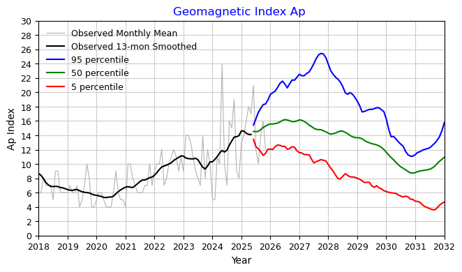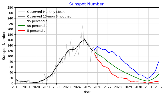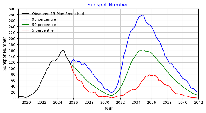 Each month the solar prediction is updated using historical and the latest month’s observed solar indices to provide estimates for the balance of the current solar cycle and the next. The forecasted solar indices represent the 13-month smoothed values consisting of a best estimate value stated as a 50-percentile value along with the 95 and 5 percentile statistical values. The F10.7 prediction also includes a 75-percentile value.