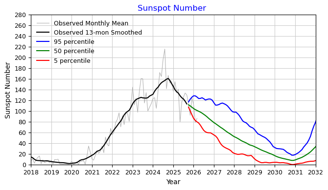 Each month the solar prediction is updated using historical and the latest month’s observed solar indices to provide estimates for the balance of the current solar cycle and the next. The forecasted solar indices represent the 13-month smoothed values consisting of a best estimate value stated as a 50-percentile value along with the 95 and 5 percentile statistical values. The F10.7 prediction also includes a 75-percentile value.