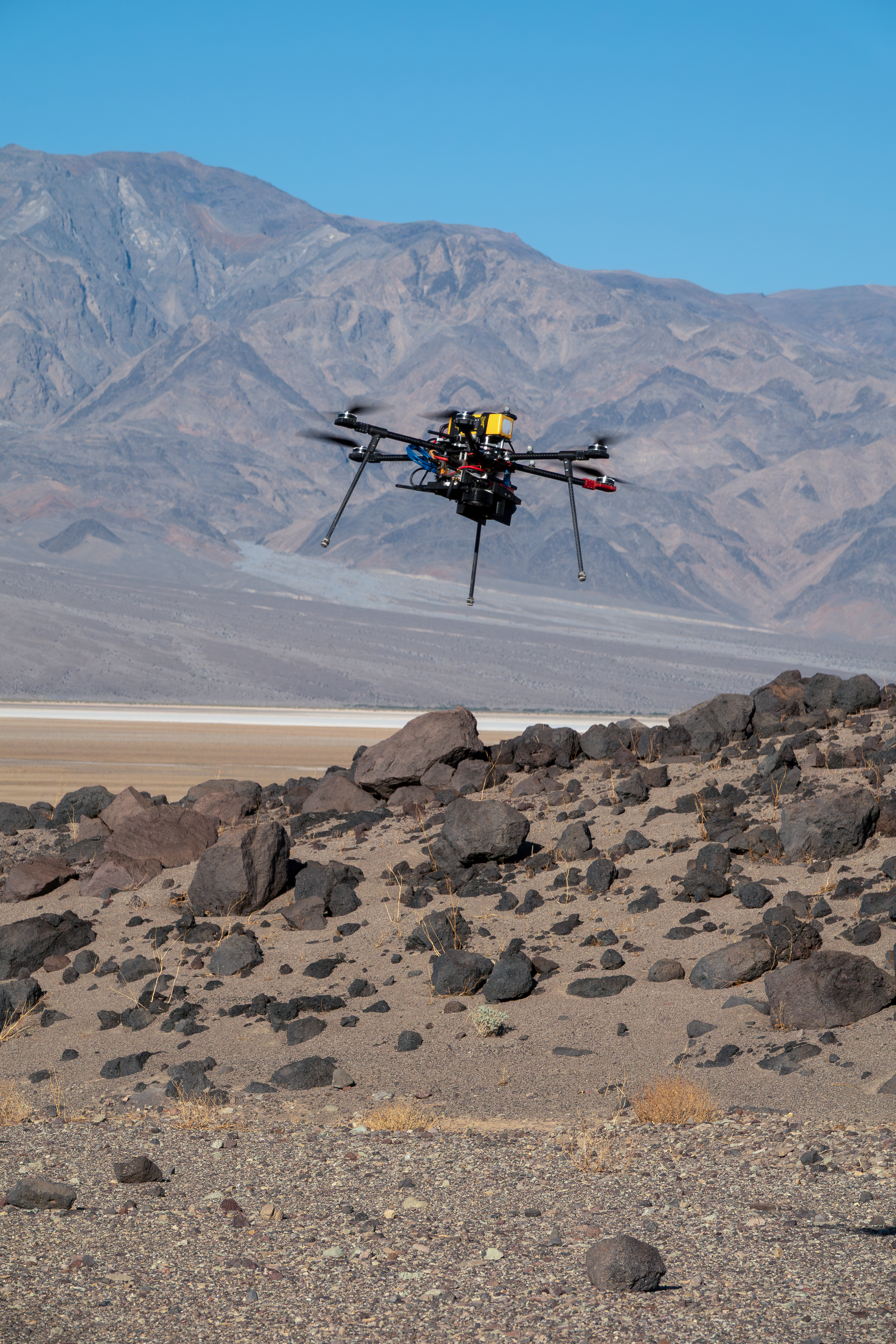 For the drone testing, engineers traveled to the park’s Mars Hill and Mesquite Flats Sand Dunes in late April and early September. The JPL team received only the third-ever license to fly research drones in Death Valley. Temperatures reached as high as 113 degrees Fahrenheit (45 degrees Celsius); gathered beneath a pop-up canopy, team members tracked the progress of their drones on a laptop.
