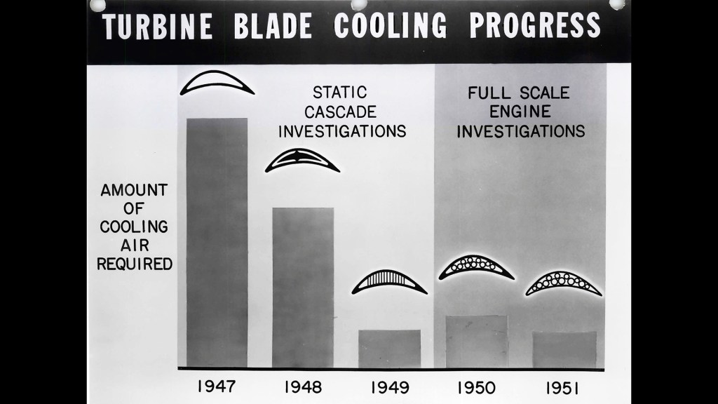 The amount of thrust an engine produces is limited by the amount of heat that the turbine can withstand. One method of increasing this capability is by cooling the hot surfaces. The goal is to provide the maximum amount of cooling using a minimum amount of coolant. Lewis investigated three types of convective cooling of turbine blades: removal of heat at the blade root, air flow through hollow blades and liquid coolant flow through hollow blades. The lab was also studying different heat resistant materials, but cooling was a more cost-effective tactic. Air cooling, which diverts excess air flow from the compressor into hollow turbine blades to carry away the heat, is the least expensive type of cooling.