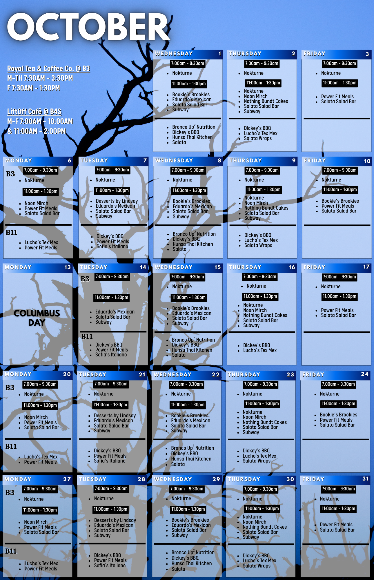 An updated breakfast menu for Vegan Vybe, a food truck vendor at JSC.September Breakfast Menu for Nokturne, a food vendor at JSC B3.JSC B3 food vendor, Nokturne's, Bento Menu for October 2, 2025. Mexican tomato Rice for $13.99.