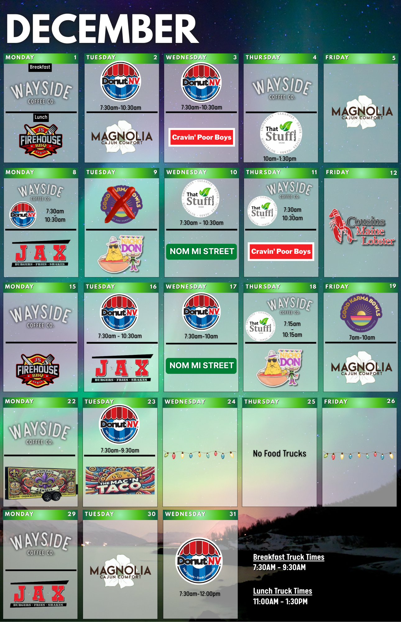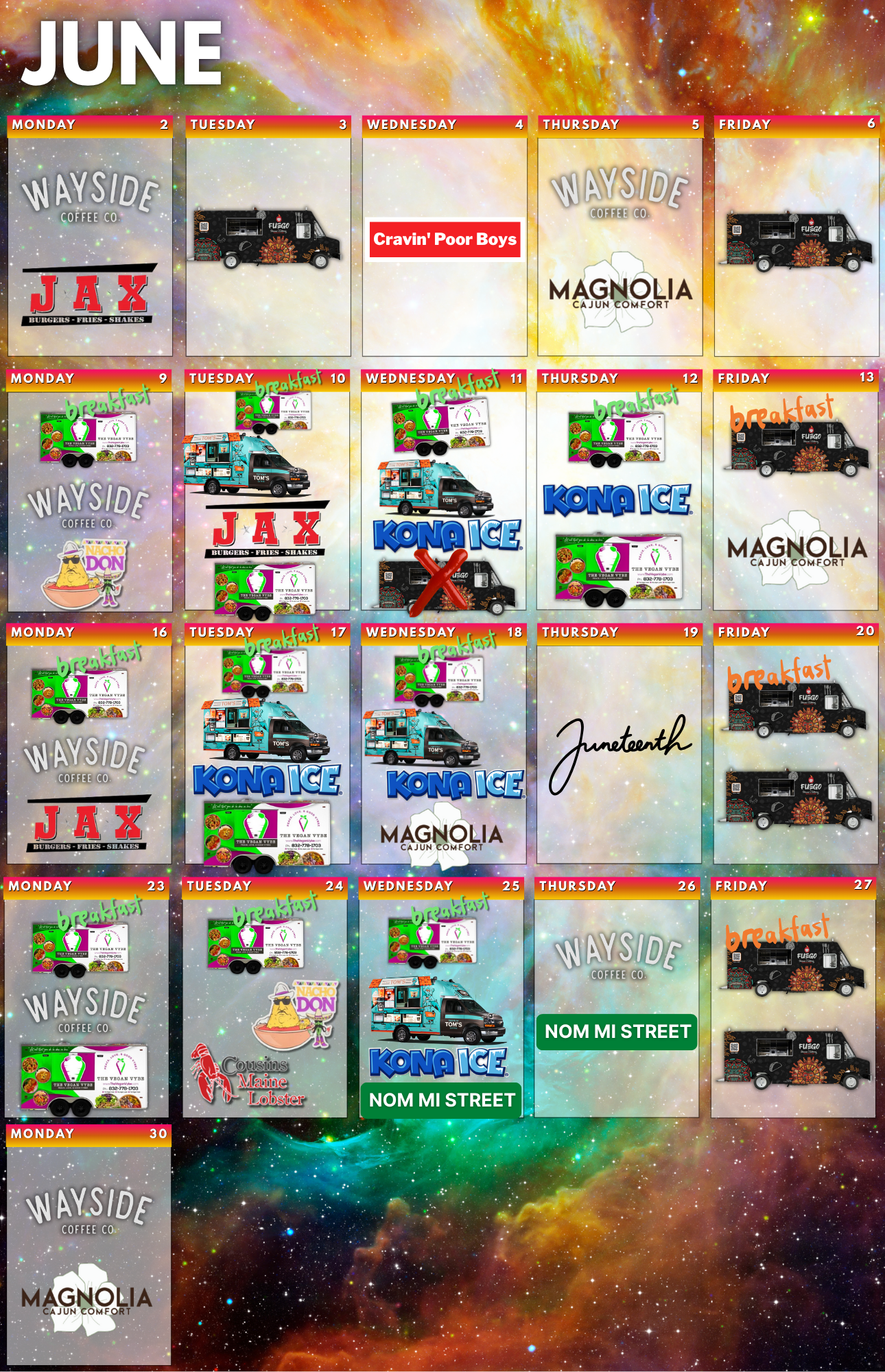 Navigate StarportStarportStarport HomeAbout StarportConnect with UsEmployment Opportunities Rules & RegulationsStarport HappeningsStarport Partners & SponsorshipsShopNASAGiftshopsShopNASA.comFood ServicesCalendarFood Truck ScheduleB3 CafeB11 CafeLiftoff Cafe @ B4SCateringMicro MarketsVending MachinesFacility ReservationsSee AllConference SpacesFieldsGymnasiumPavilionsRental PricingReservation Request FormRules & GuidelinesFitnessAll Fitness ServicesFacilitiesGroup ExerciseMembershipsPersonal TrainingPremium Classes & WorkshopsWellnessAll Wellness ProgramsFinancial WellnessNutrition CoachingMassage TherapyStretch TherapyRecreational ProgramsAll ProgramsCloggingCountry & Western DanceCreative Writing GuitarIrish DanceKaratePhotography PianoSalsa / Latin DanceSelf DefenseVideographyLeague SportsEAA ScheduleSpecial EventsAliens vs Astronauts 5KBreakfast with SantaCelebration Events Chili CookoffGolf TournamentNASA Sports EventsPop-Up Shops at JSC Reconnection HoursRodeoDiscount ProgramDiscount ProgramDiscount TicketsAdditional ServicesHoney Baked HamsMemorial TreesNASA ClubsScholarship ProgramStarport DonationsSwapShop Food Trucks Announcements Food Truck Schedule *Please note: the food truck schedule is subject to change without notice. No food trucks scheduled on federal holidays. Food Truck Menus DonutNV Sep 30, 2025 JPEG (1.33 MB) Cousins Maine Lobster Aug 19, 2025 PDF (157.34 KB) Travelin’ Tom’s Coffee Truck Menu Jun 9, 2025 PDF (1.86 MB) J’s Firehouse BBQ Jun 27, 2024 PDF (341.84 KB) The Vegan Vybe May 6, 2024 PDF (3.36 MB) Keep Exploring Discover More Starport Food Services B11 Café B3 Coffee Bar and Café B4S Liftoff Café Food Services