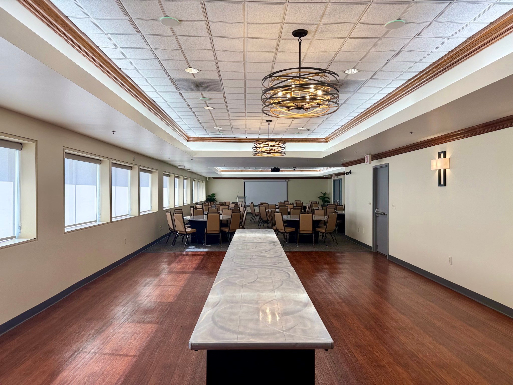 The Destiny Ballroom (Room 104) offers flexible space for up to 300 guests, depending on the room configuration. The ballroom can be arranged with round tables for dining or theater-style seating for presentations and performances. A built-in stage is included, and a dance floor can be added to create the perfect setting for special events.
