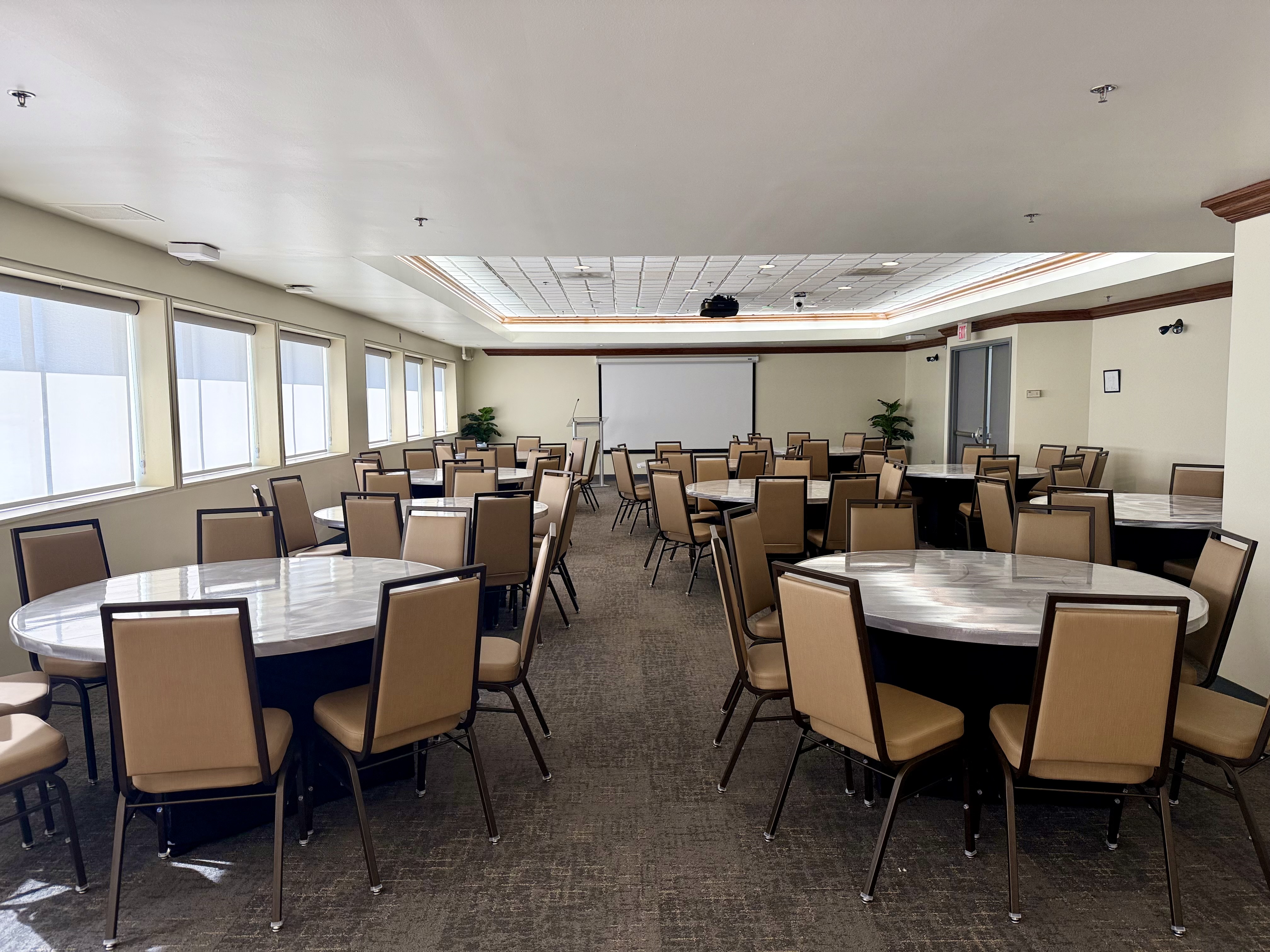 The Destiny Ballroom (Room 104) offers flexible space for up to 300 guests, depending on the room configuration. The ballroom can be arranged with round tables for dining or theater-style seating for presentations and performances. A built-in stage is included, and a dance floor can be added to create the perfect setting for special events.