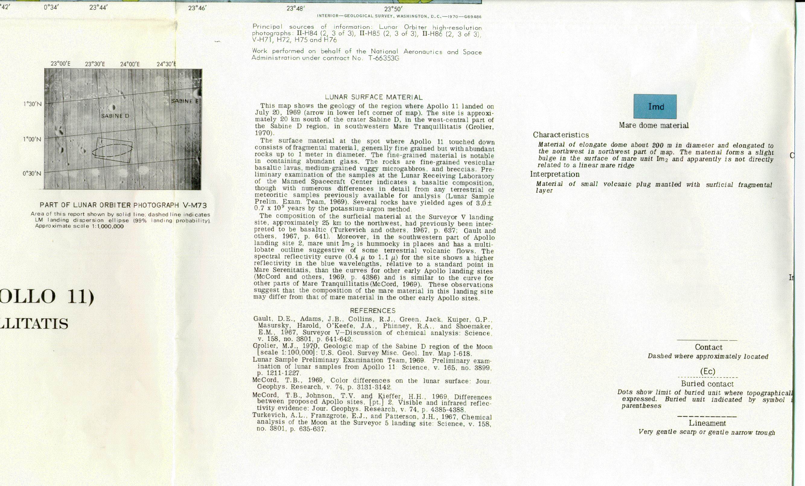 The text that accompanies the map indicates "Because the graphical method by which these data have been obtained is fairly crude, azimuths shown for individual frames may have errors of 3° or more. Positions of most of the camera stations are probably within a 1.5-m circle centered at the point shown. The determinations are sufficiently accurate, however, to provide a useful control net for an overall view of the astronauts' traverse and a starting point for more rigorous analytical photogrammetric measurements."Apollo 11 Traverse Map, Defense Mapping Agency ( 0.7 Mb )