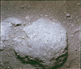 At least some of the large pieces in this image appear to be soil clods, perhaps resulting from disturbance of the area by one of the landing probes. See, for example, AS11-40-5917. Note that the area shown is 72 mm by 83 mm. Red-blue anaglyph created by Erwin D'Hoore.AS11-45-6706 Wiggle Stereo ( 0.2Mb )