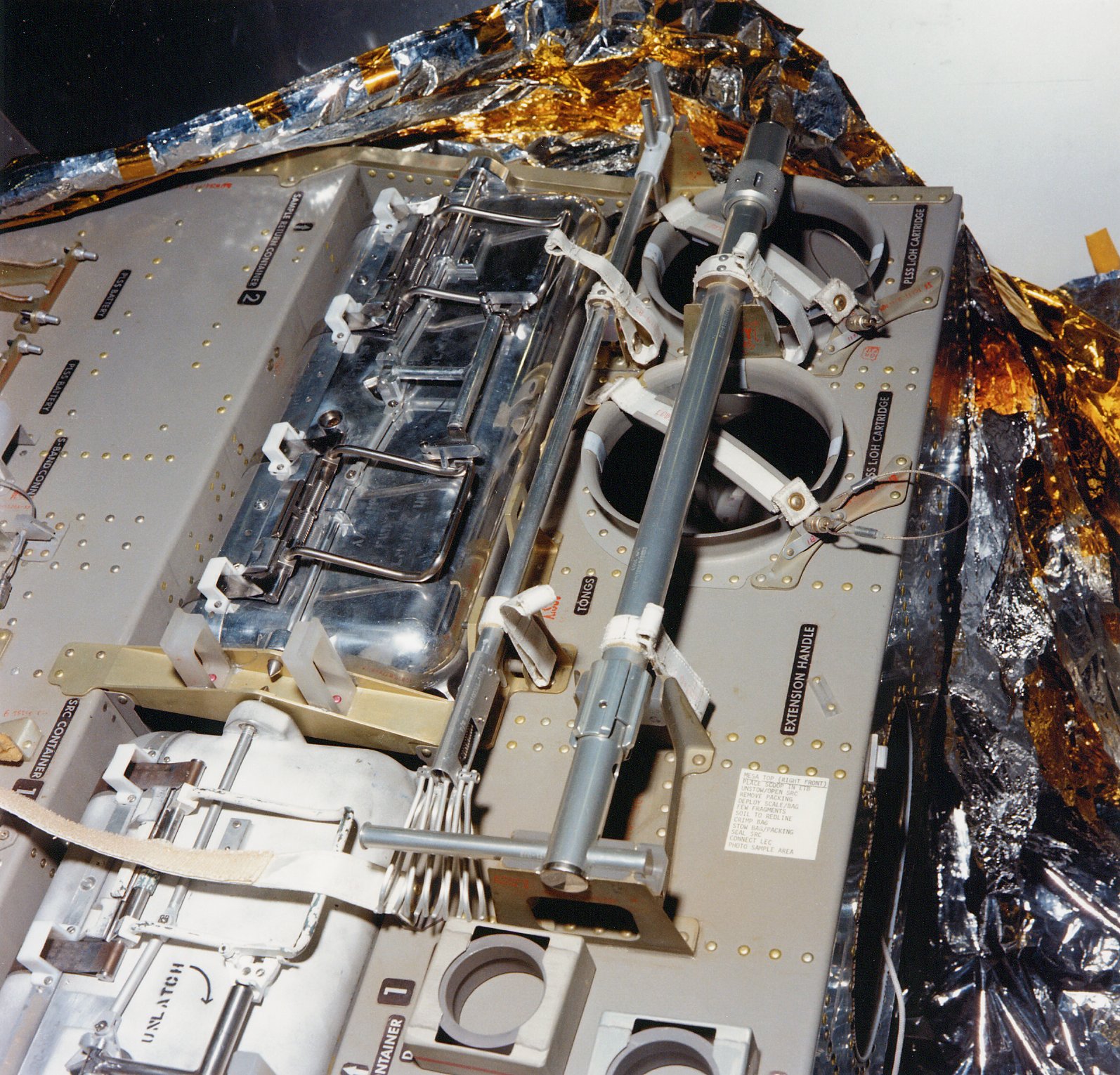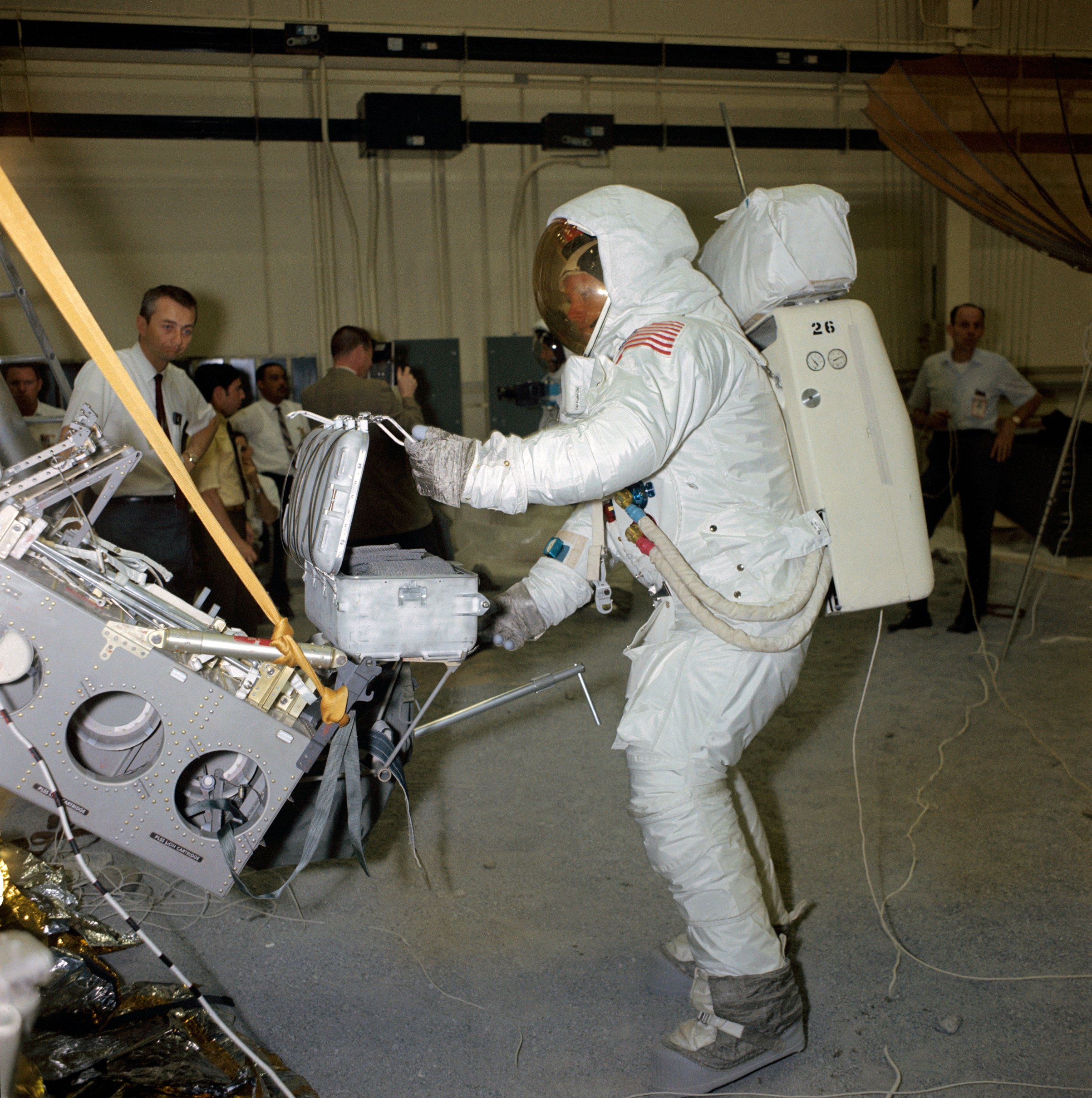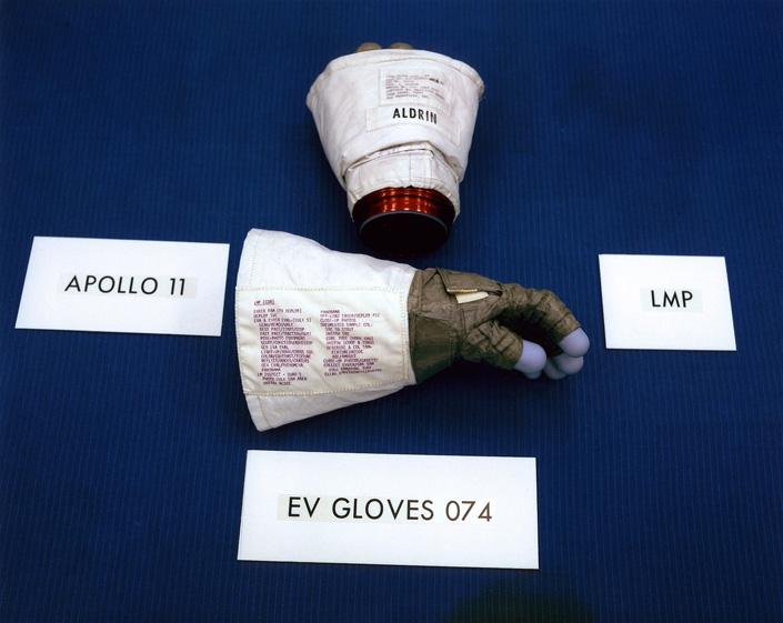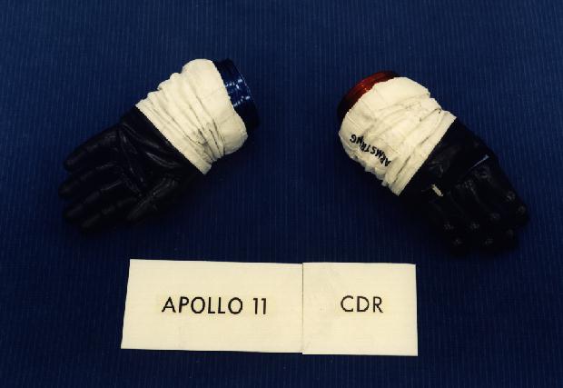 The suits worn by Neil and Buzz on the Moon are seen here on display at the National Air and Space Museum in 1999. Training versions of the Gold camera (lower left), the Solar Wind Collector (right of center) and the EASEP (right foreground) are also displayed. Photo by Ken Glover.IVA Glove at the Kansas Cosmosphere ( 209k )