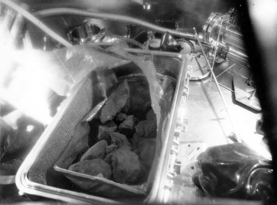 This is the second rock box Neil filled on the lunar surface. It is the Documented Sample Apollo Lunar Sample Retrun Container and contains approximately 20 grab samples weighing a total of 5.5 kilograms. Neil collected these in about 3 1/2 minutes before starting closeout activities. As he used the tongs to collect a representative sampling of rocks, he put them in a 'weigh bag' made of teflon film. Once he was done, he put the entire weigh bag in the rockbox. In the photo, we see that the weigh bag has been torn open to reveal the rocks. Neil also packed the two core tubes in this box and these can be seen at the upper left. The gloved right hand of the vacuum-chamber operator is at the lower right. 26 July 1969. Scan courtesy NASA Johnson.69-H-1223 ( 134k )