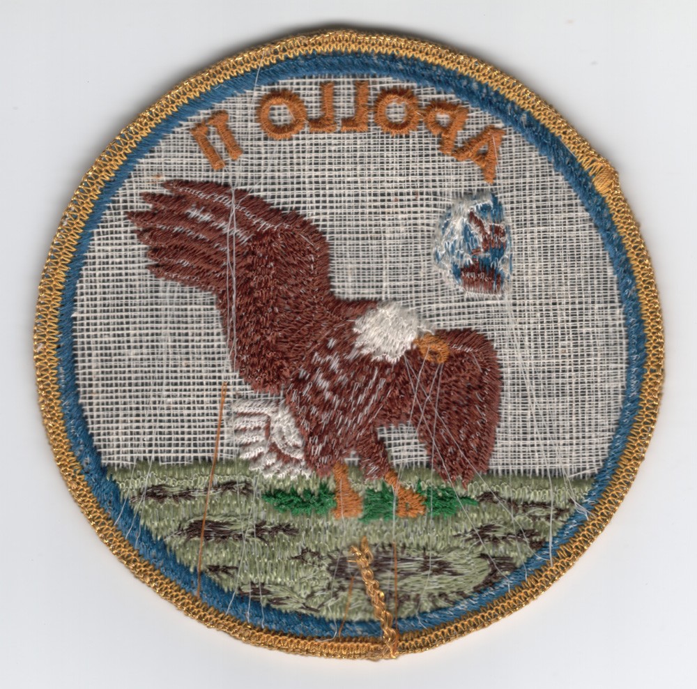. Colin Mackellar displays an Apollo 11 patch provided by Stan Lebar, the Westinghouse Lunar Camera Program Manager. "Stan kindly loaned me his original A11 patch to scan for the HSK website. it looks fantastic when held up to the light. I suppose I really should call it an 'embroidered patch. The colour varies quite a bit (depending on lighting and background), but in full sunlight, the border is lovely gold, and the blue border is iridescent. The oblique shot(linked below) is probably the closest. I have no idea how many of these were produced, but Stan was given this one for his part in managing the Apollo 11 Lunar TV Camera program." Compare with the version printed on a square of Beta cloth ( 1.4Mb ) and then sewn on Neil's flown suit.Flown Apollo 11 Interim Stowage Assembly ( 0.4 Mb )Colin provided photos of the patch face-on on a white background ( 1Mb, face-on on a purple background ( 1.3Mb ), reversed ( 0.3Mb ), at an oblique angle ( 0.3Mb ), and face-on in a scanner ( 1.3Mb ). 2 March 2009.