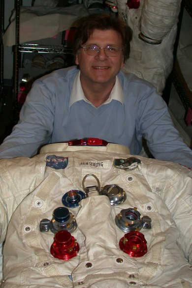 Ulli Lotzman poses with Neil's flown suit at the National Air and Space Musuem's Garber Facility. See, also, Karl Dodenhoff's connector layout diagram. Ulli notes, "The patches and name tags and the Apollo 11 suits were never removed - they are the original, flown ones." April 2006.Original Name Tag on Neil's Flown Suit ( 41k )