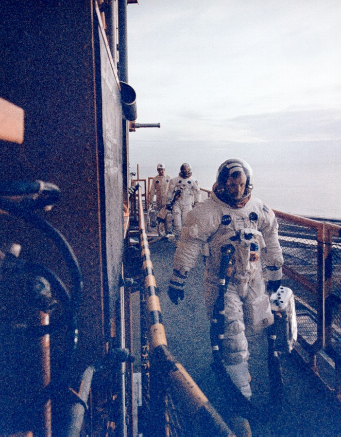 The Apollo 11 crewmen, wearing biological isolation garments, arrive aboard the U.S.S. Hornet during recovery operations in the central Pacific. 24 July 1969. Scan by Ed Hengeveld.USS Hornet Patch ( 143k )