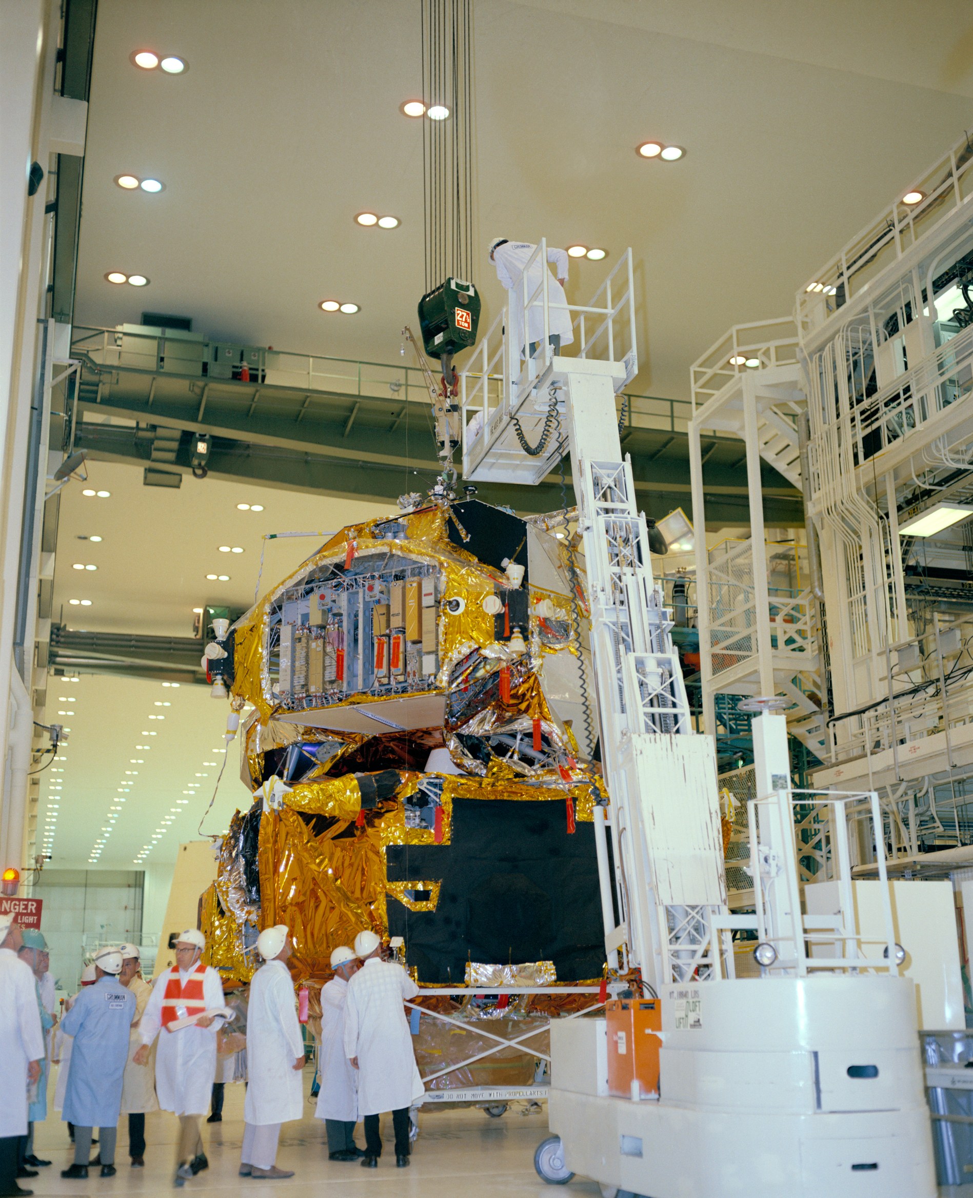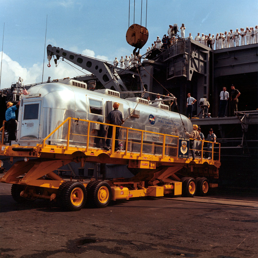 Offloading of the Mobile Quarantine Facility from the USS Hornet, to be sent to Hickam AFB, Hawaii. 26 July 1969. Scan by J.L. Pickering.S69-40147 ( 76k or 189k )