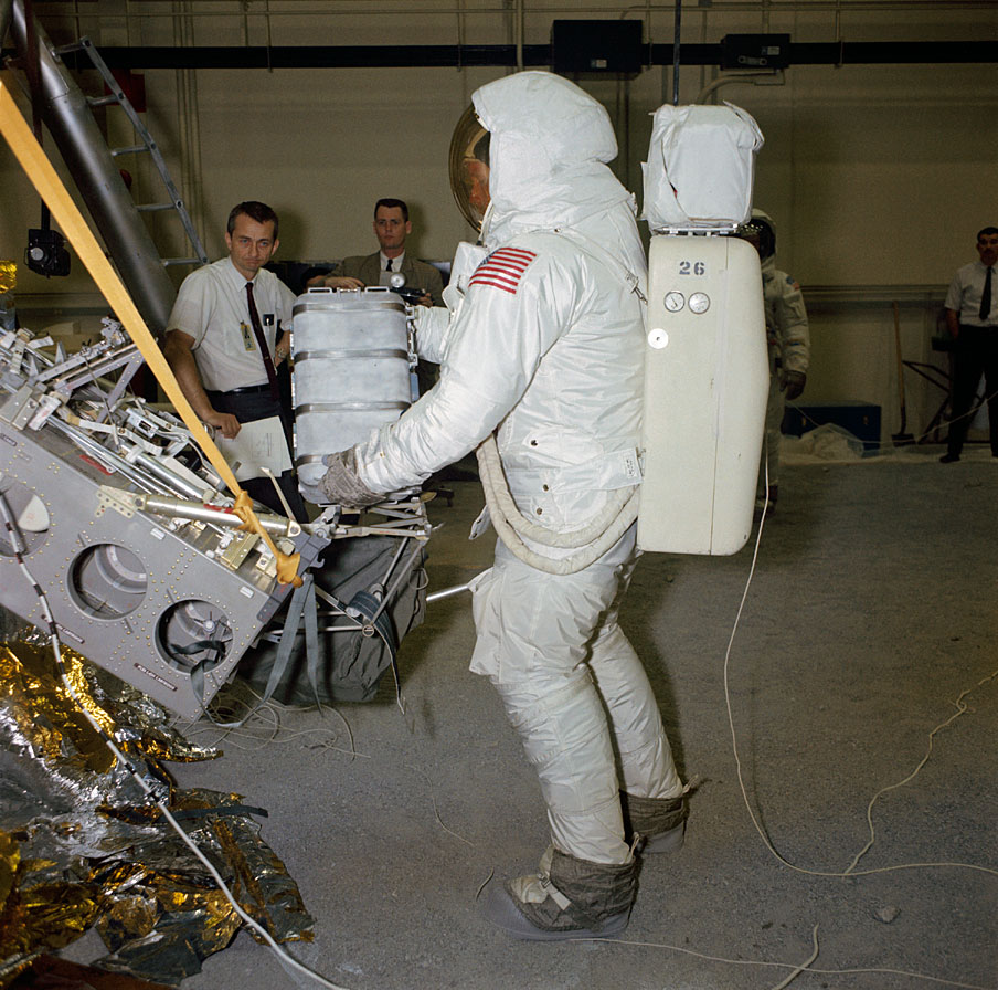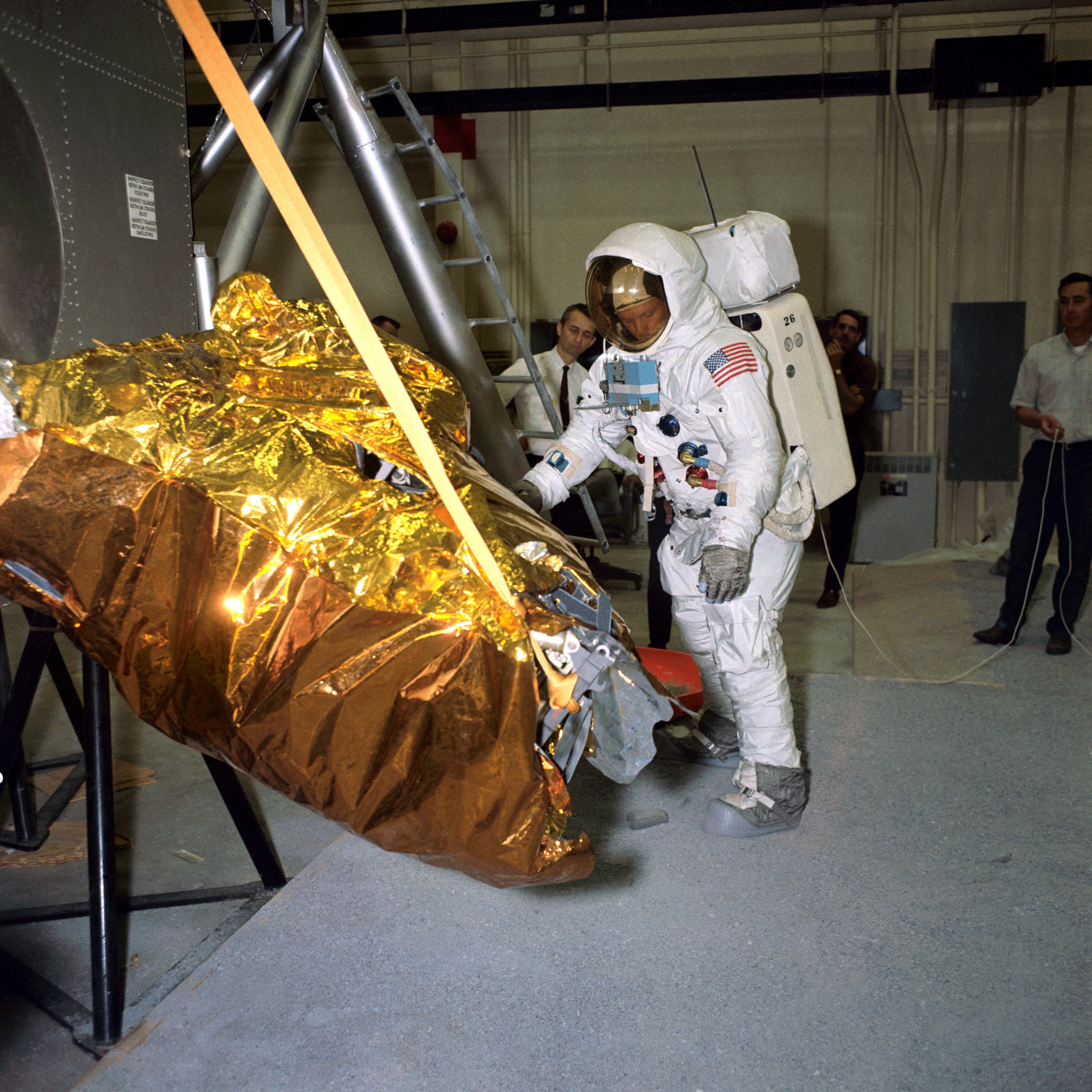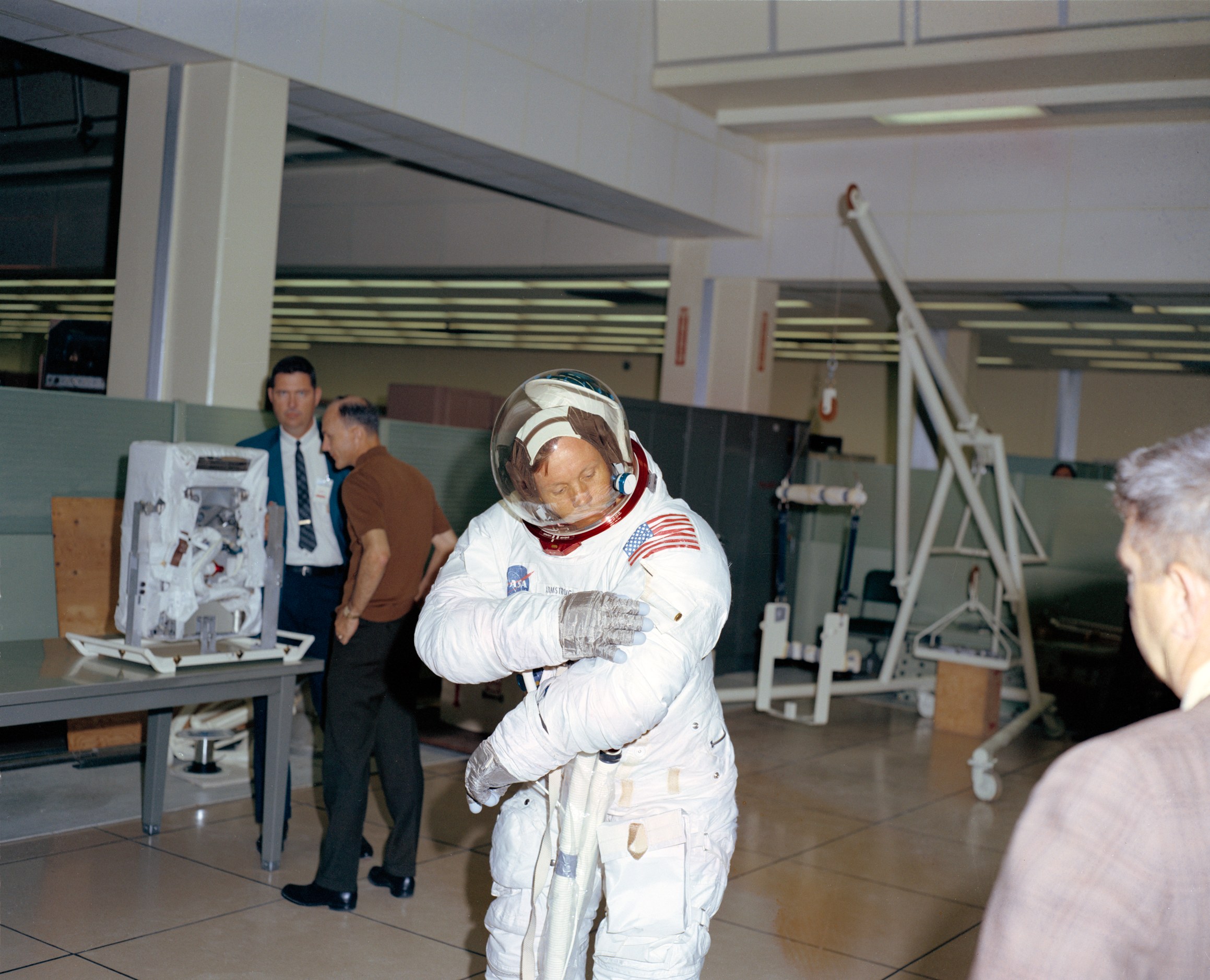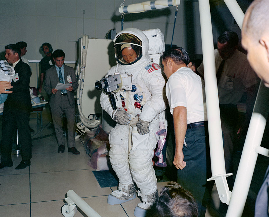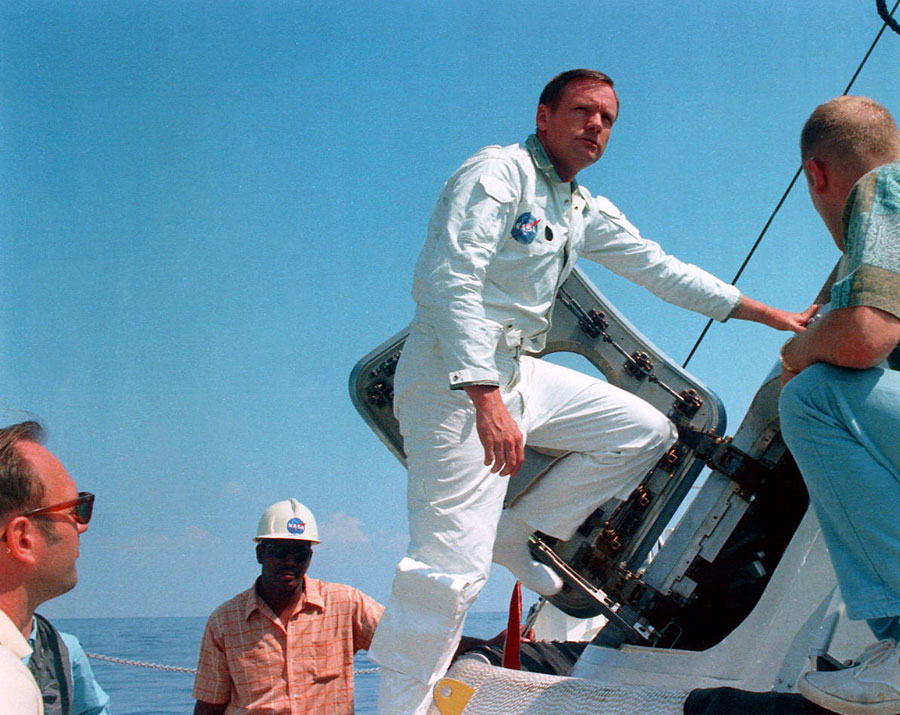 The fact that Neil is wearing his "Hornet Plus Three" badge suggests that this photo was taken on-board the recovery ship. Unknown photographer. Scan courtsey Connie Moore/NASA HQ.S69-40210 ( 1.1 Mb )