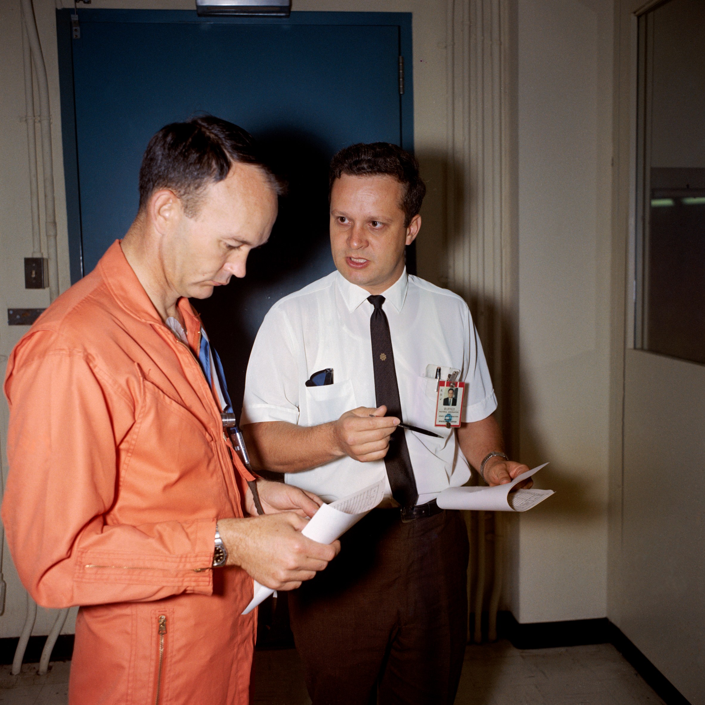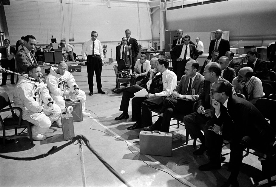 Armstrong, Collins, Aldrin (left to right) examining mission photos, apparently out-the-window photos of the LM shadow area. Photo filed 3 August 1969. Scan by Kipp Teague.S69-47292 ( 60k or 6.1Mb )