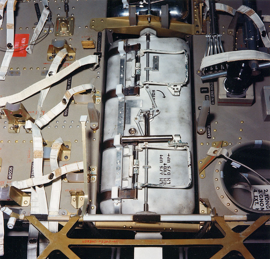 View of the back, top, and lefthand side of the Hasselblad magazine used by Neil Armstrong and Buzz Aldrin during the Apollo 11 EVA. Note the hook on the back that was used to attach the magazine to the Lunar Equipment Conveyor (LEC) for transfer to the cabin at the end of the EVA. Note, also, the orange decal on the top showing f-stops to be used for photography in various directions relative to the Sun. Note, also, the wire handle on the lefthand side attached to dark slide that was in place whenever the magazine wasn't attached to the camera. In the case of this magazine, the dark slide was removed early in preparations for the EVA, just before the magazine was attached to the EVA Hasselblad. The dark slide was then stowed in the LHSSC (Left Hand Side Stowage Compartment and wasn't inserted again until the magazine was transferred back up to the cabin on the LEC at the end of the EVA. October 2004. Photo by Ulli Lotzmann at the National Air and Space Museum.Hasselblad Magazine S - Top View ( 141k )