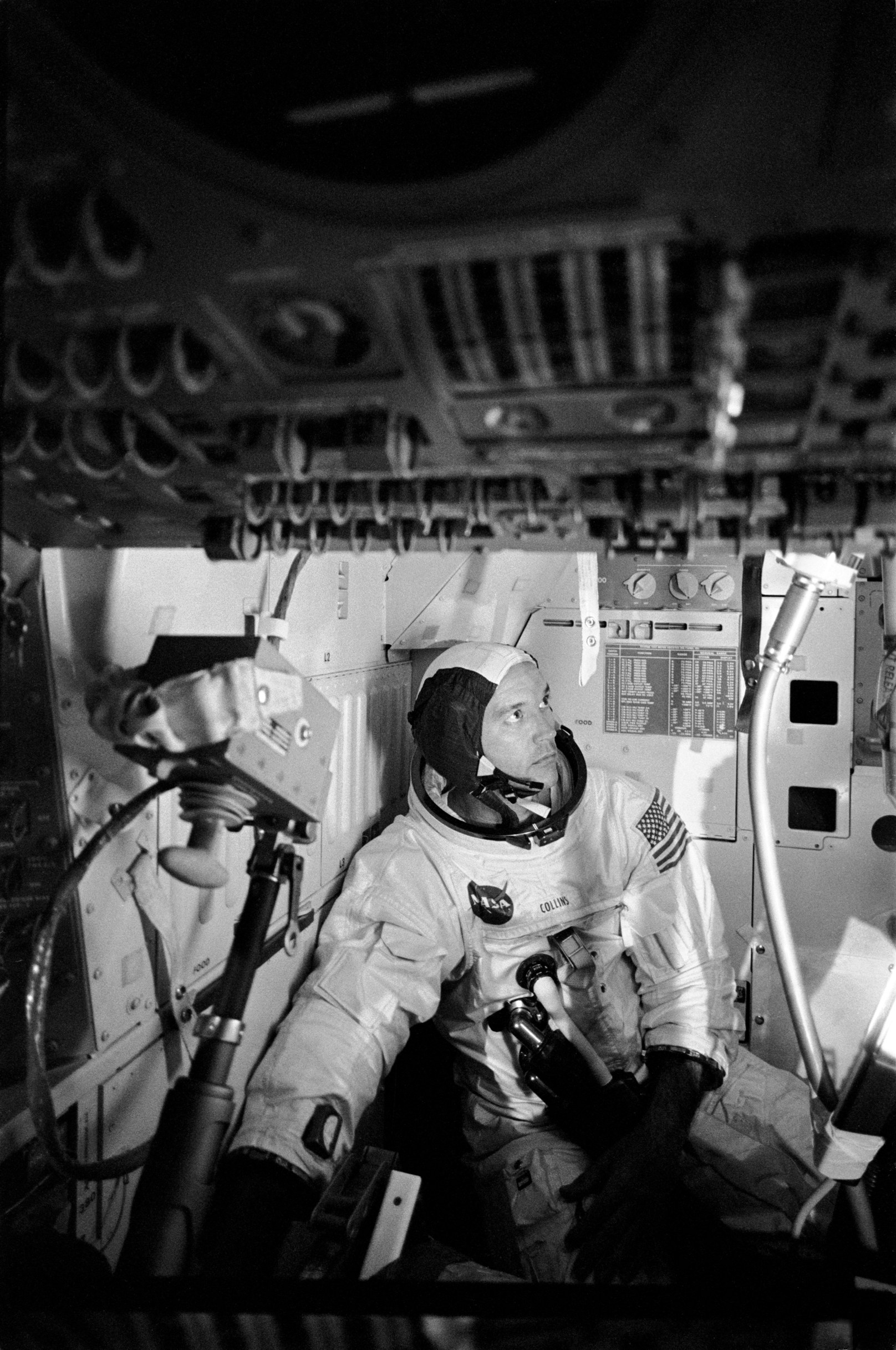 Mike Collins sits in hatch of Apollo 11 Command Module after its return to the Lunar Receiving Laboratory for detailed examination. Scan by J.L Pickering.69-H-1421 ( 136k )