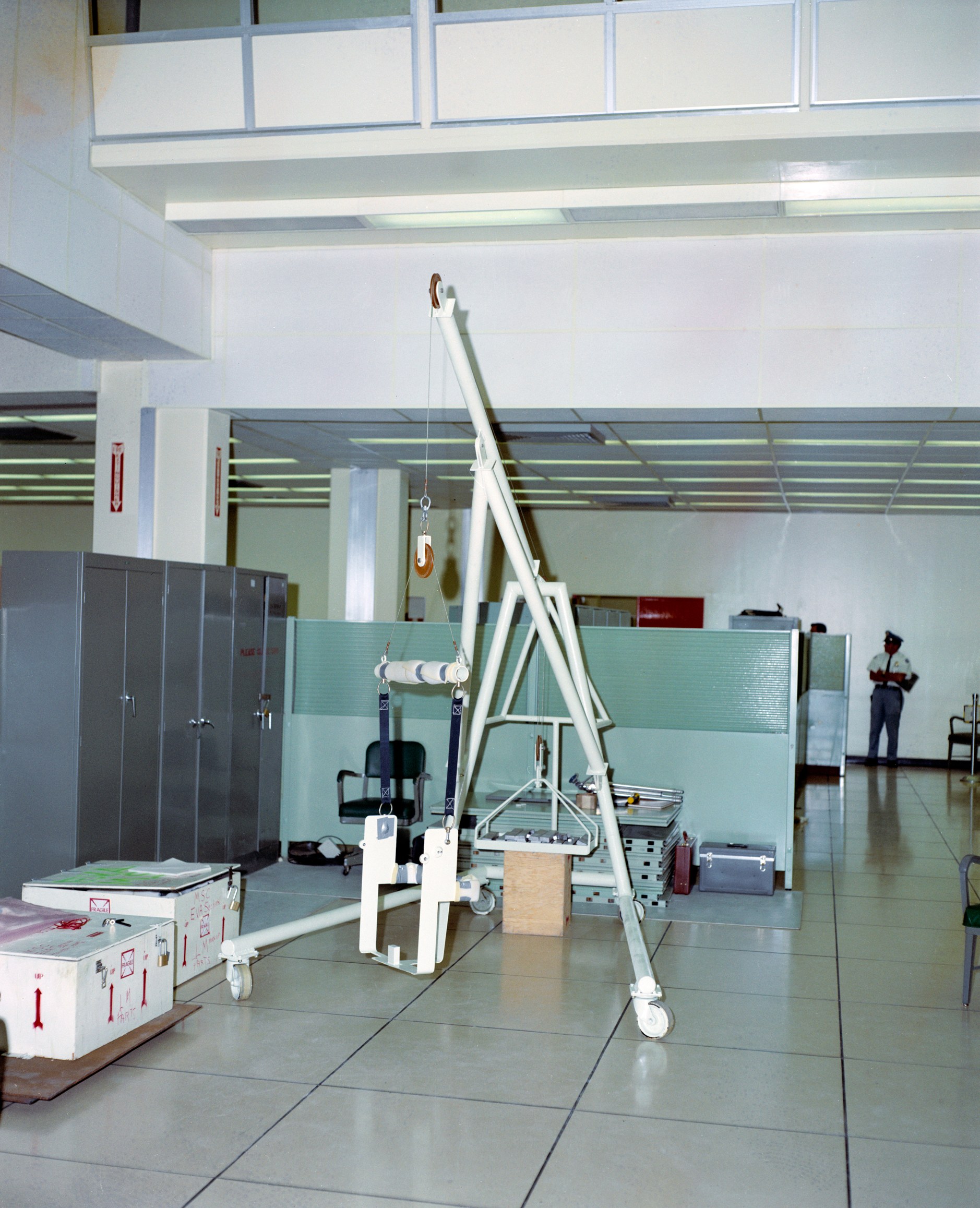 The first Apollo 11 sample return container, containing lunar surface material, is unloaded at the Lunar Receiving Laboratory, bldg 37, Manned Spacecraft Center. 25 July 1969. Scan by Ed Hengeveld.S69-45002 ( 291k or 2351k )