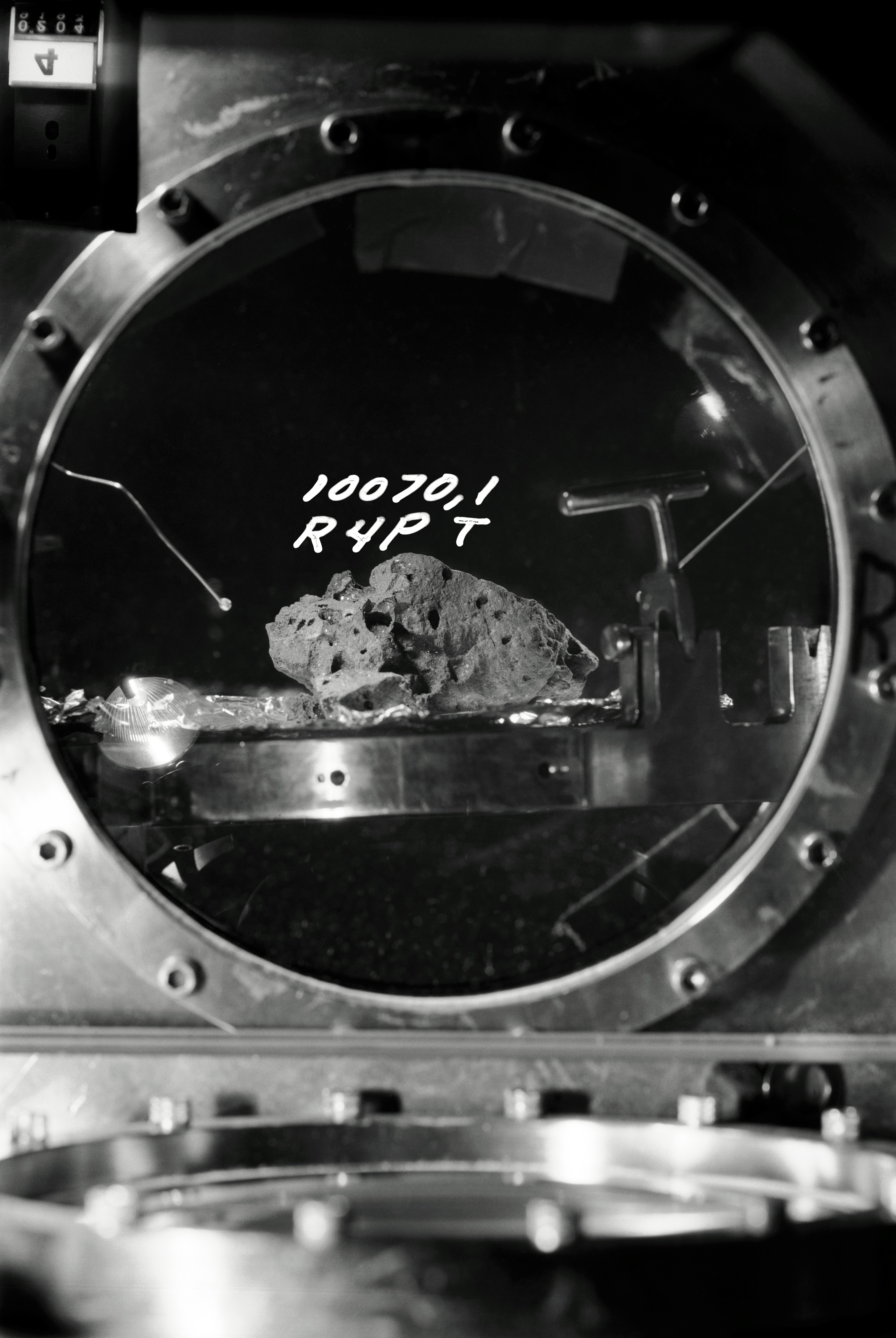 Apollo 11 sample 10072,0 is a 447-gram piece of highly vesicular basalt collected by Neil after 1112009. NASA scan courtesy Gary Lofgren and Terrie Bevill.S69-40958 ( 156k or 677k )