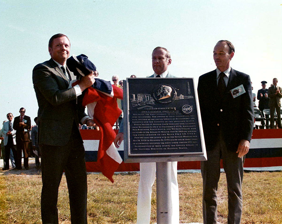 On the 5th anniversary of the Apollo 11 launch, Armstrong (left), Aldrin, and Collins unveil a plaque designating Launch Complex 39 at the Cape as a site listed in the National Register of Historic Places. 16 July 1974. Scan by J.L. Pickering.74-H-551 (128k)