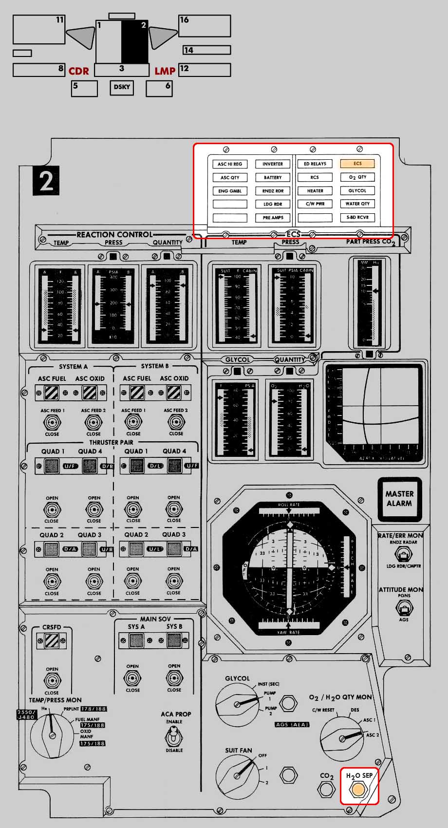 [Al is referring to the 'CWEA Status' item at the middle of the righthand column on Sur-72. The ASC Press(ure) warning light on Panel 1 is on. The Preamps, ECS, and H2O SEP Comp(onent) Caution lights on Panel 2 are on.]131:35:13 Conrad: All right. (Long Pause) Get it.