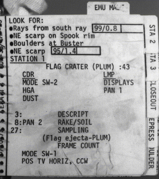 [This sample is 60095, a 47-gram piece of glass that Charlie collected at the drill site at 121:53:10 and showed to Houston at 122:25:42.]124:10:15 England: Okay; and we'll need an EMU check before you drive off. (Pause)[John stows the gnomon.]