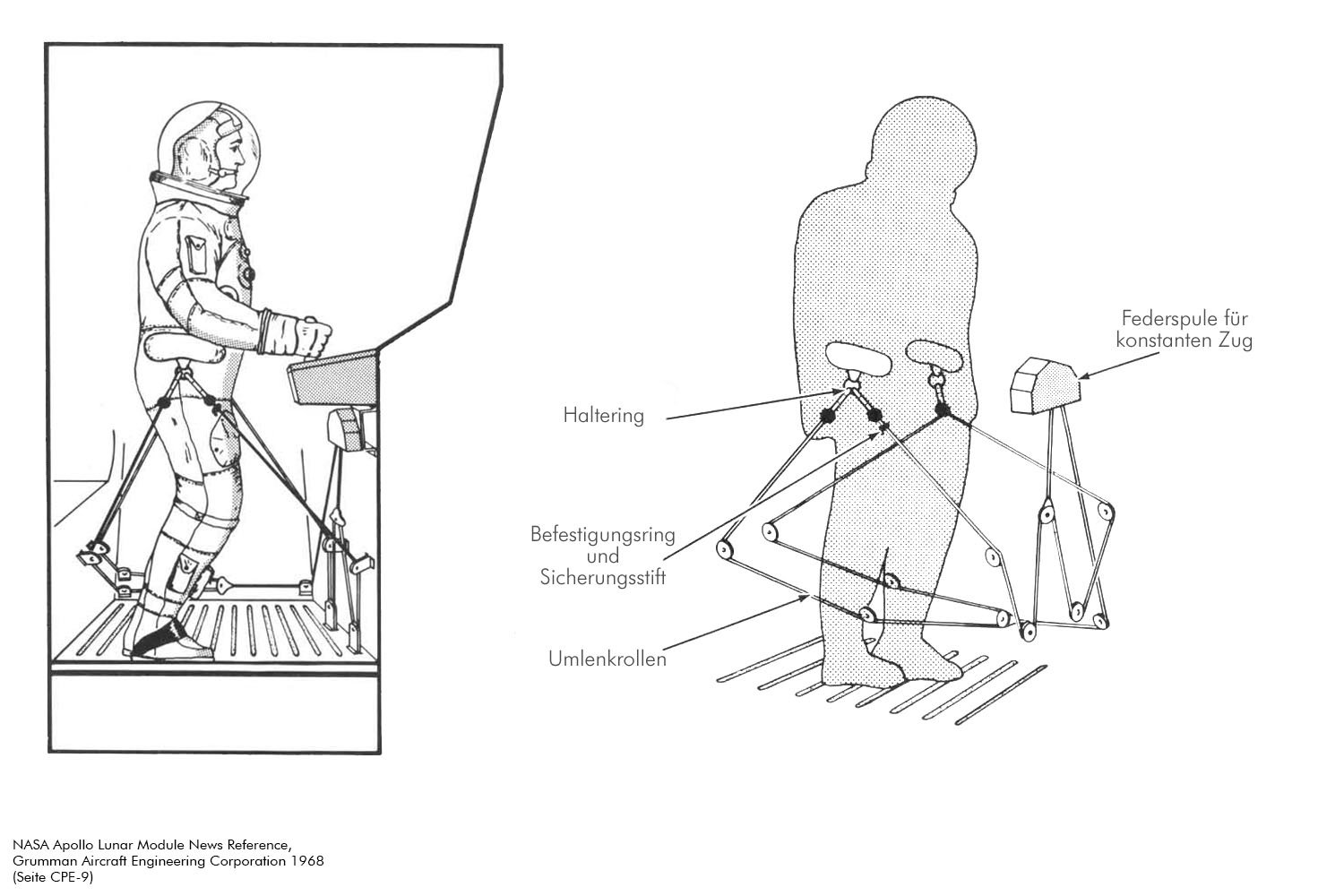 Aldrin: Verstanden. Neil hat auf der Triebwerksabdeckung gelegen und sich aus der Sicherungsleine eine ganz brauchbare Schlinge für seine Beine gemacht. Ich habe mich auf dem Boden zusammengerollt. Ende.