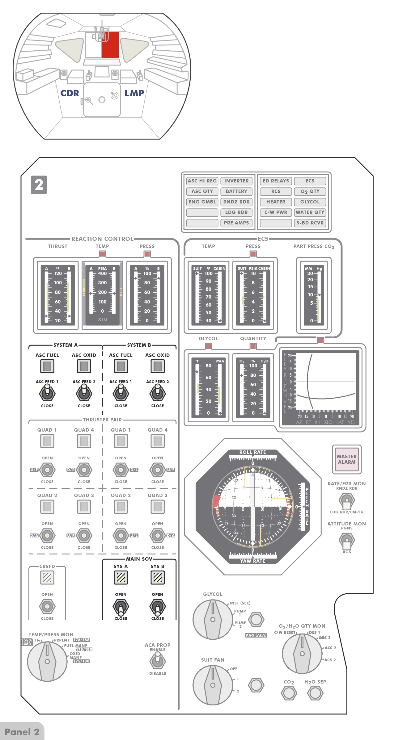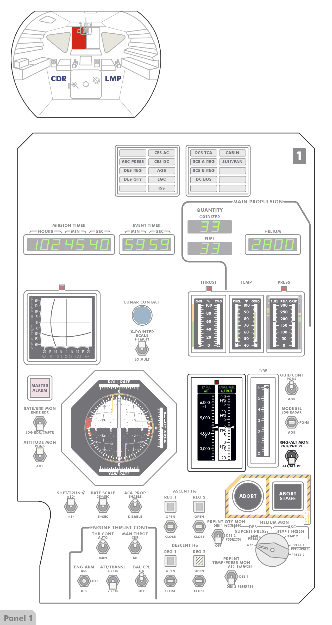 Buzz hat vor sich eine Tabelle, die ihm zeigt, wie sich Zeit, Horizontalgeschwindigkeit, Vertikalgeschwindigkeit und, etwas weniger wichtig, Flughöhe zueinander verhalten müssen. Solange sie die notwendige Horizontalgeschwindigkeit erreichen und hoch genug aufsteigen, um die größten Berge überfliegen zu können, werden sie in einen Orbit eintreten. Sollten sie dann etwas höher oder tiefer fliegen als vorgesehen, wird der Orbit durch kurzes Zünden der Manövrierdüsen zu einem bestimmten Zeitpunkt angepasst, damit das Rendezvous von Eagle und Columbia sicher stattfinden kann.