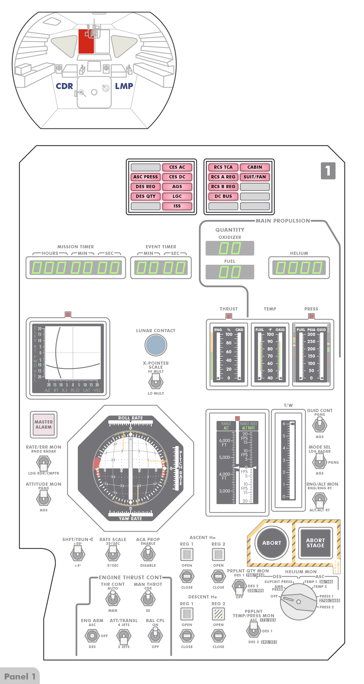 RCURemote Control Unit die Warnanzeigen für Sauerstoff und Druck erschienen. Eine Möglichkeit, auf die in der Checkliste (SUR-92) hingewiesen wird. Die Warnleuchte für Kabinendruck ist rot, wie alle Warnleuchten auf Paneel 1. Die Warnleuchten auf Paneel 2 sind gelb.