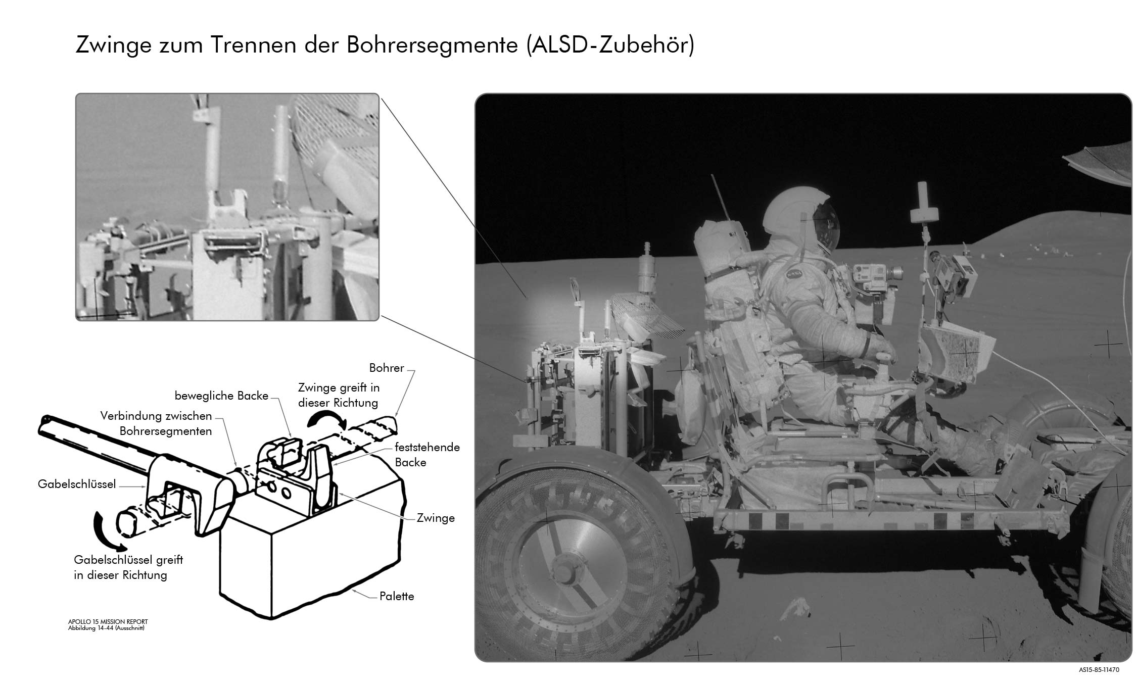 Scott: Okay, Joe. Die Fahrtrichtungsanzeige steht auf 2 – 9 – 2 (LRV-Paneel). Und Jim, ich fahre nach links. (Pause) Damit kein Staub auf deine Experimente fliegt. (Pause) Okay, du stehst am richtigen Platz.